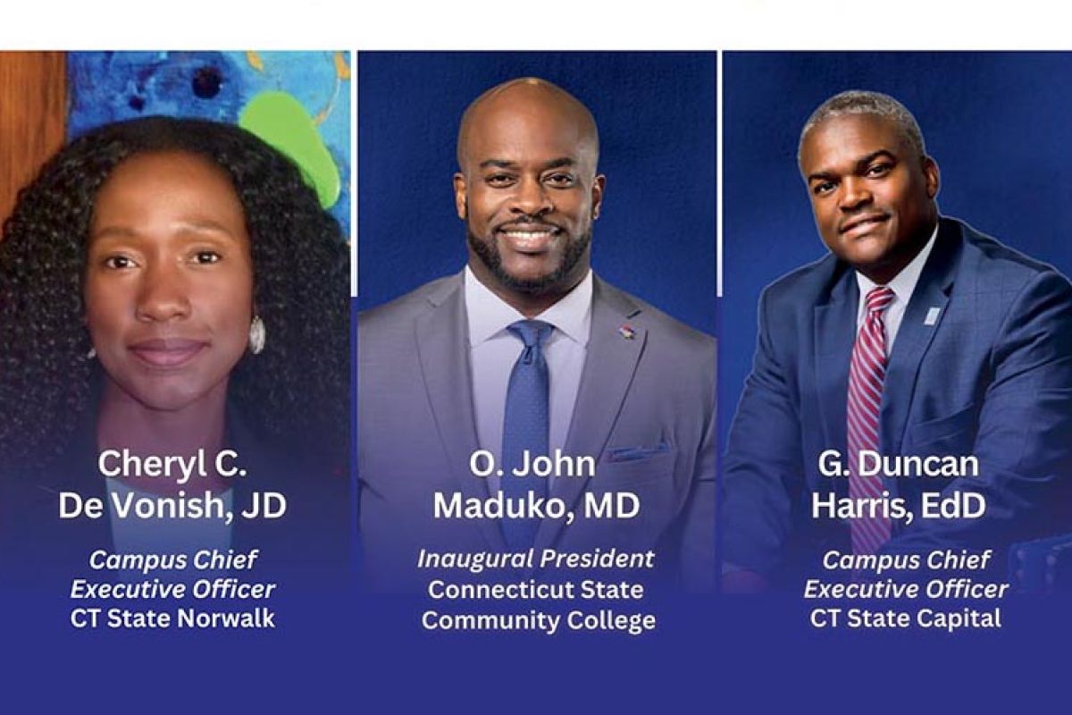 CT State Community College (CT State) President O. John Maduko, M.D., along with campus CEOs Cheryl De Vonish, J.D. (CT State Norwalk), and Duncan Harris, Ed.D. (CT State Capital), have been named to the 100 Most Influential Blacks in Connecticut for 2024 by the National Association for the Advancement of Colored People’s (NAACP) Connecticut chapter. The award honors their leadership and contributions to both Connecticut and the broader community.